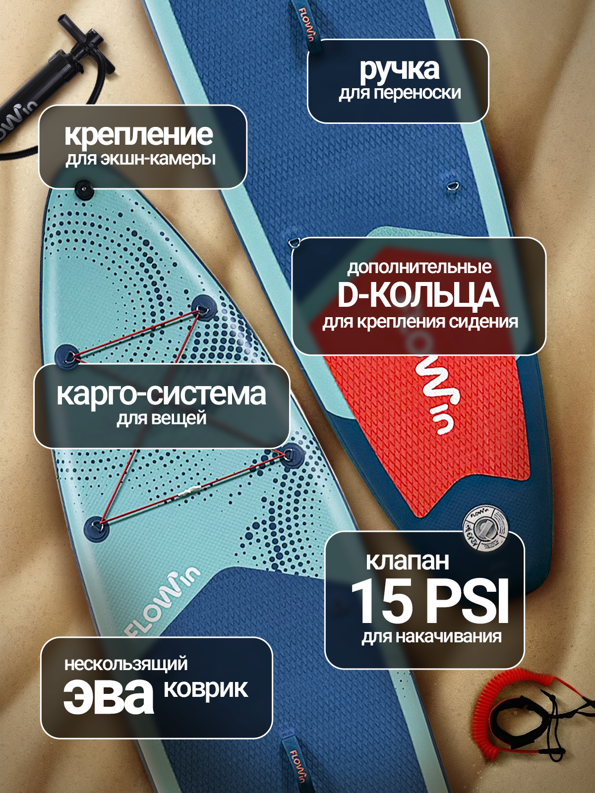 - Удобство: В комплекте двухходовой насос, который надувает доску при движении как вниз, так и вверх, а также сдувает сап.